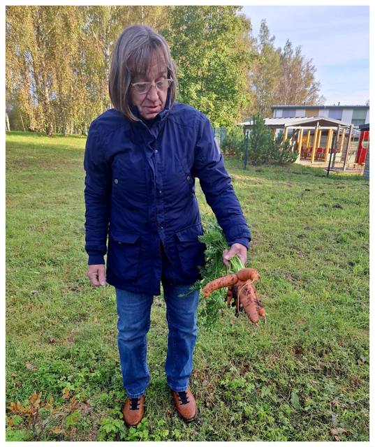 Kopā ar permakultūras speciālisti Gunu Zālamani sākām veidot jaunas dobes. Guna ne tikai dalījās ar gudriem padomiem, bet arī parādīja, kāds priecīgs un veselīgs burkāns šogad izaudzis viņas dārzā.