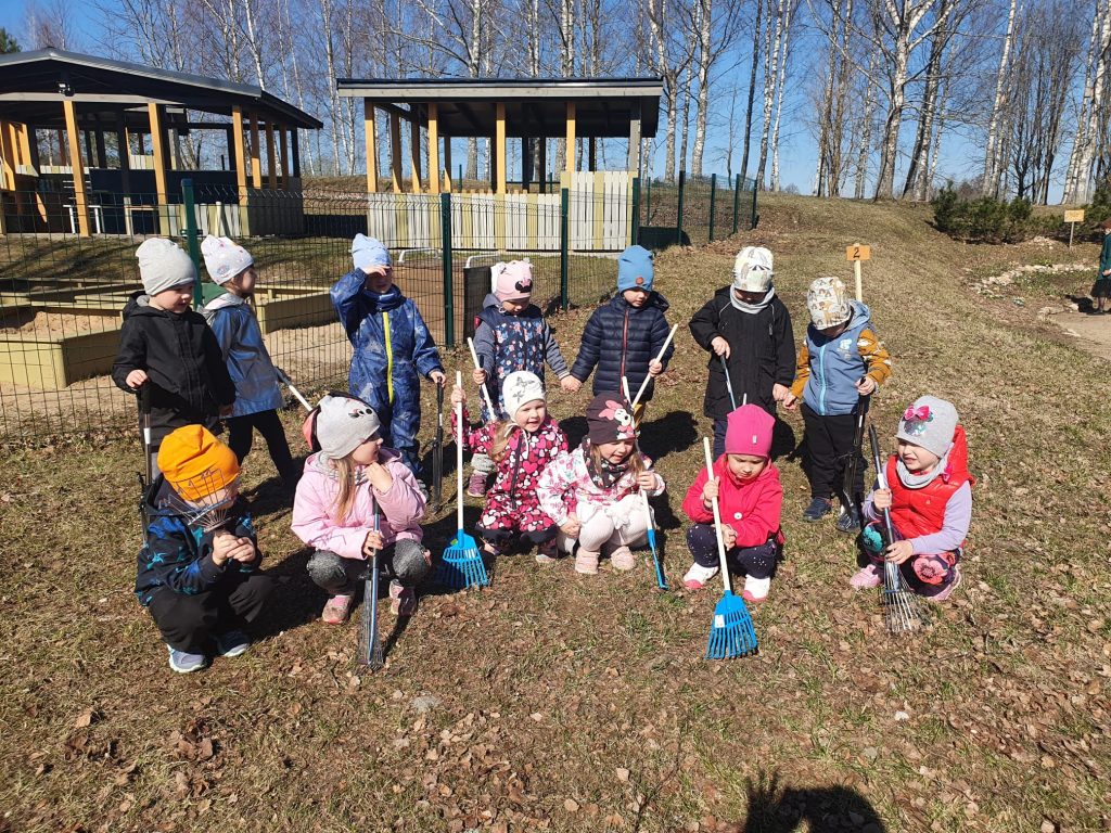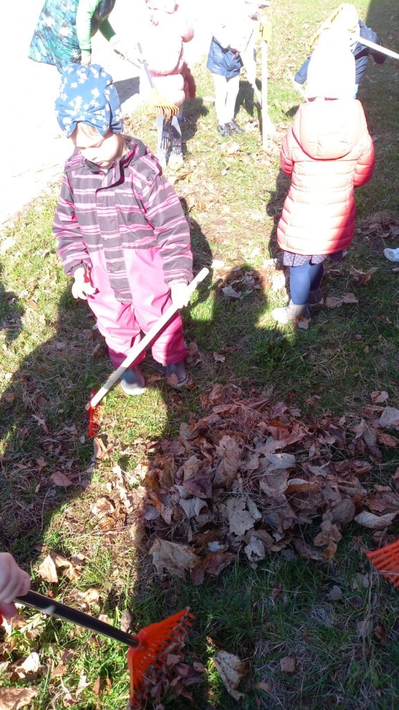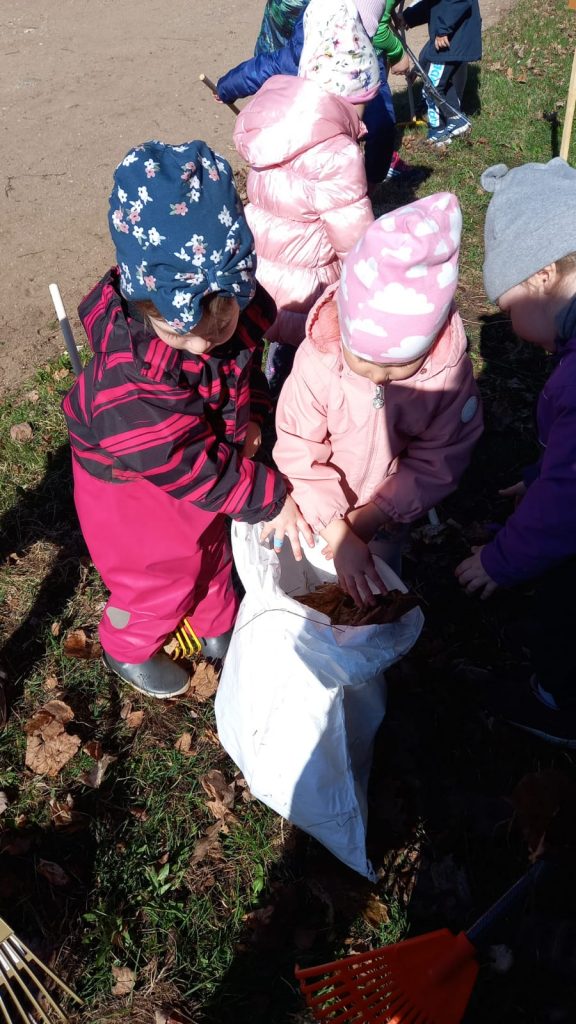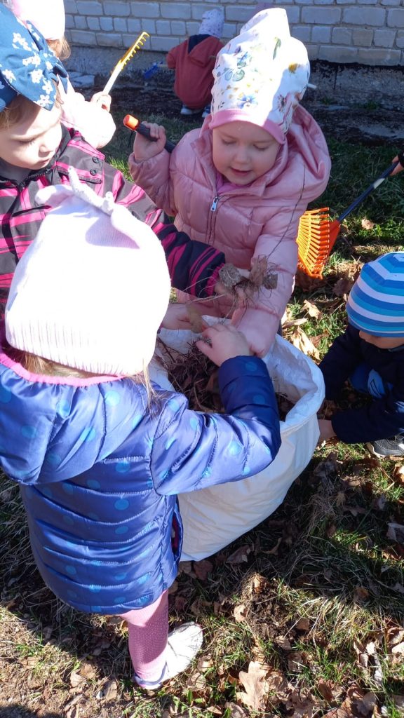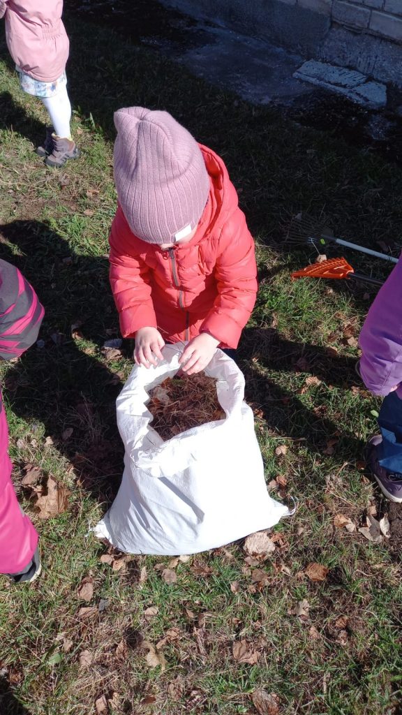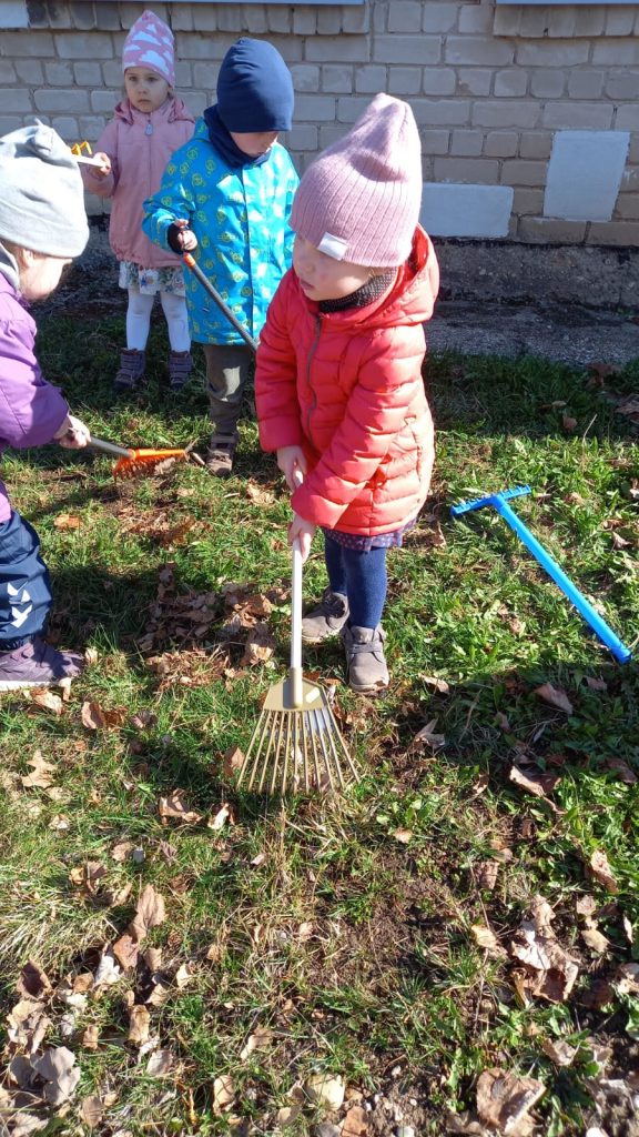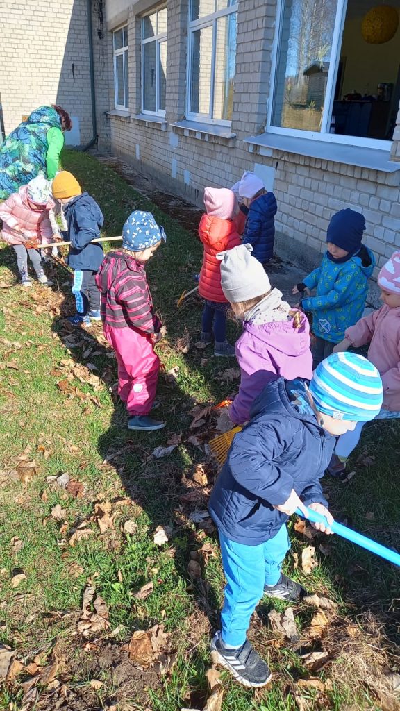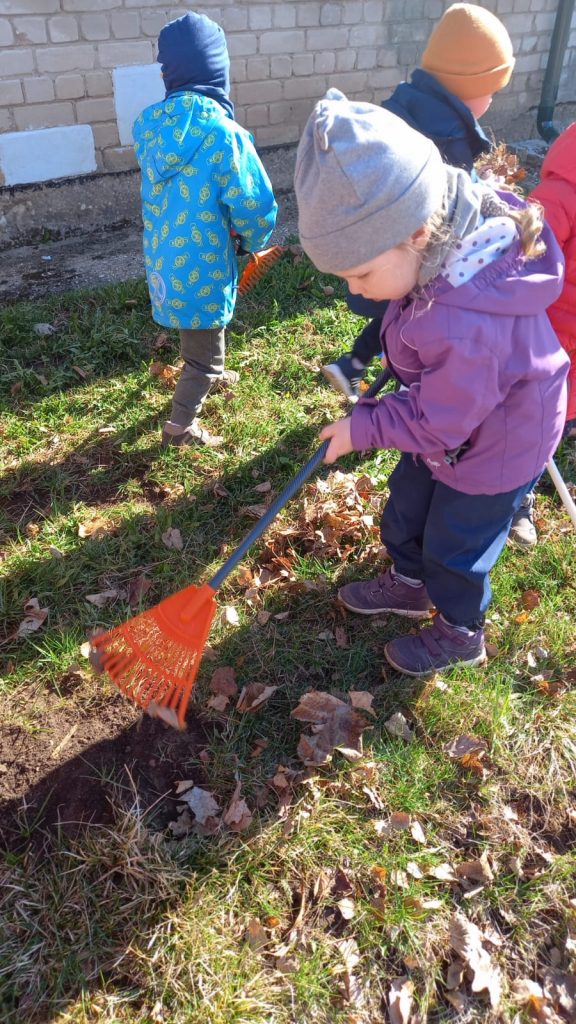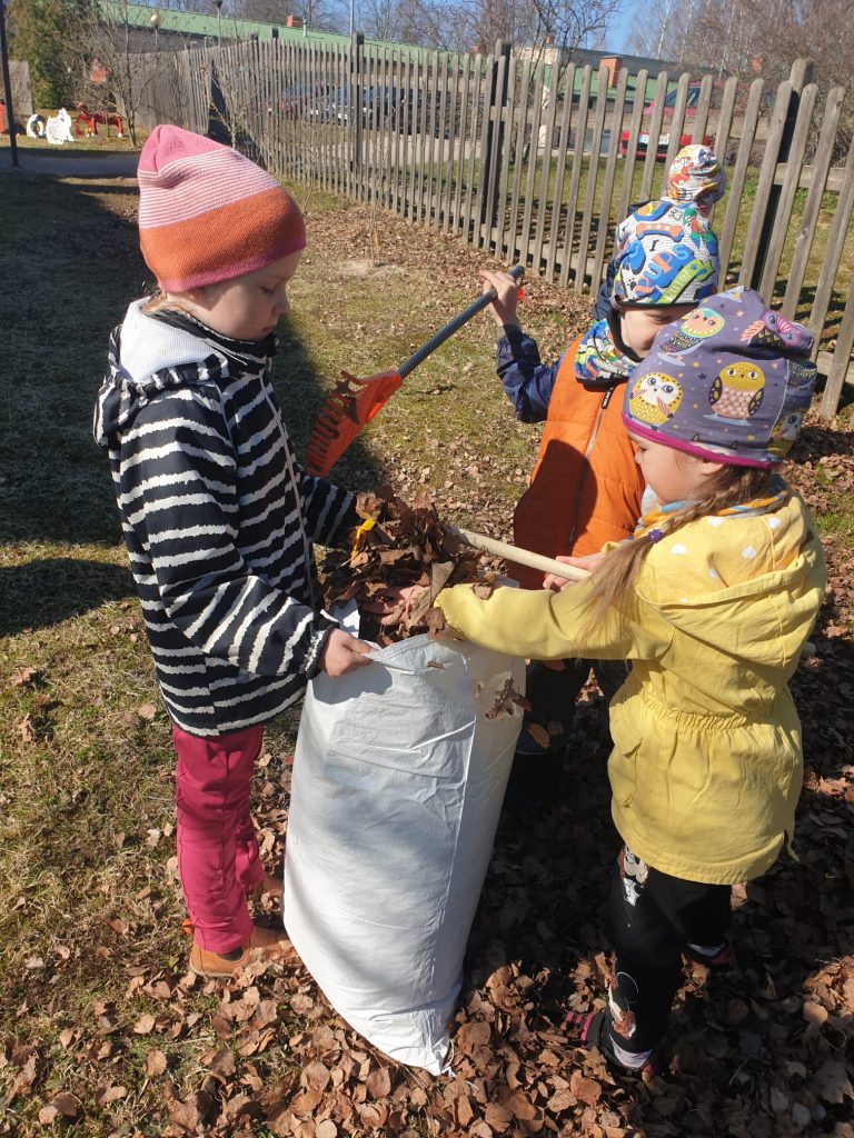 Grupām bija sagatavoti uzdevumi atbilstoši vecumam – sadalītas teritorijas, ko katra grupa apņēmības pilni devās sakopt! Grāba lapas un lika maisos, ko vēlāk izbēra komposta kaudzēs, gan vāca žagarus, ko negantais vējš nolauzis kokiem!