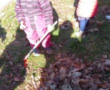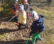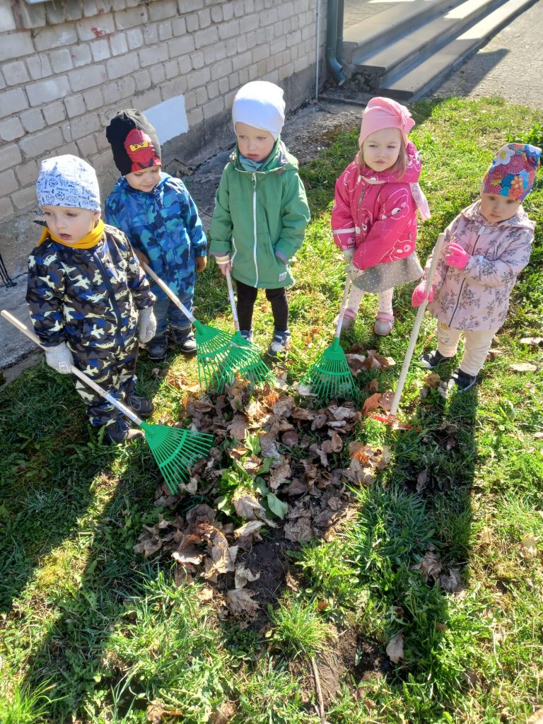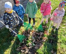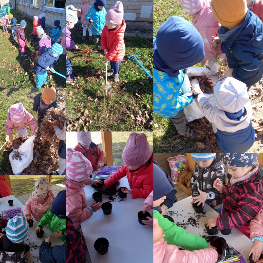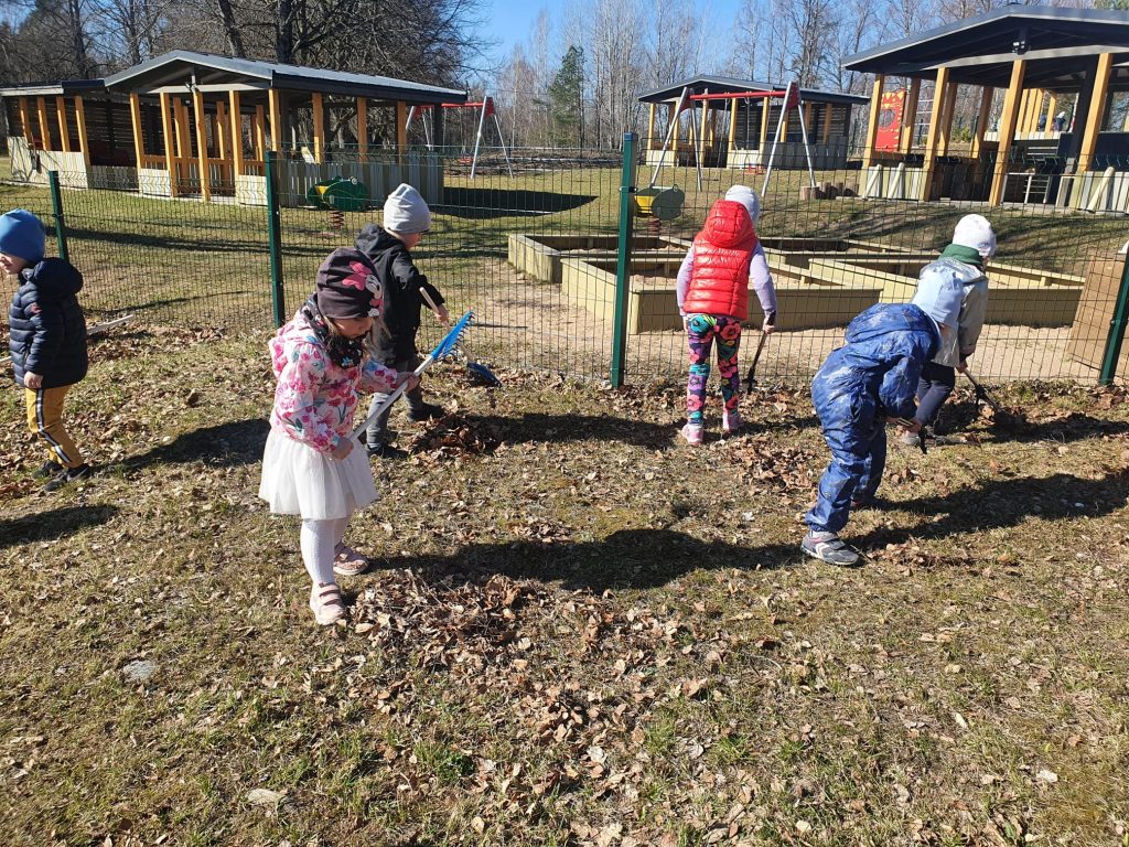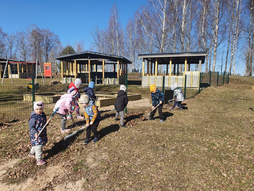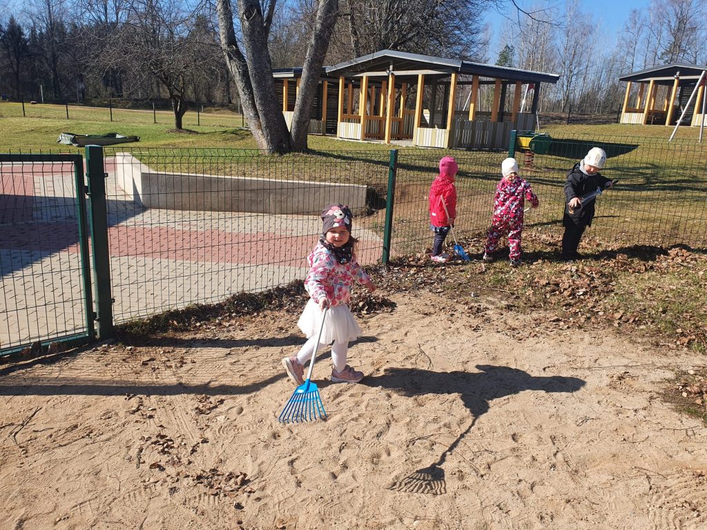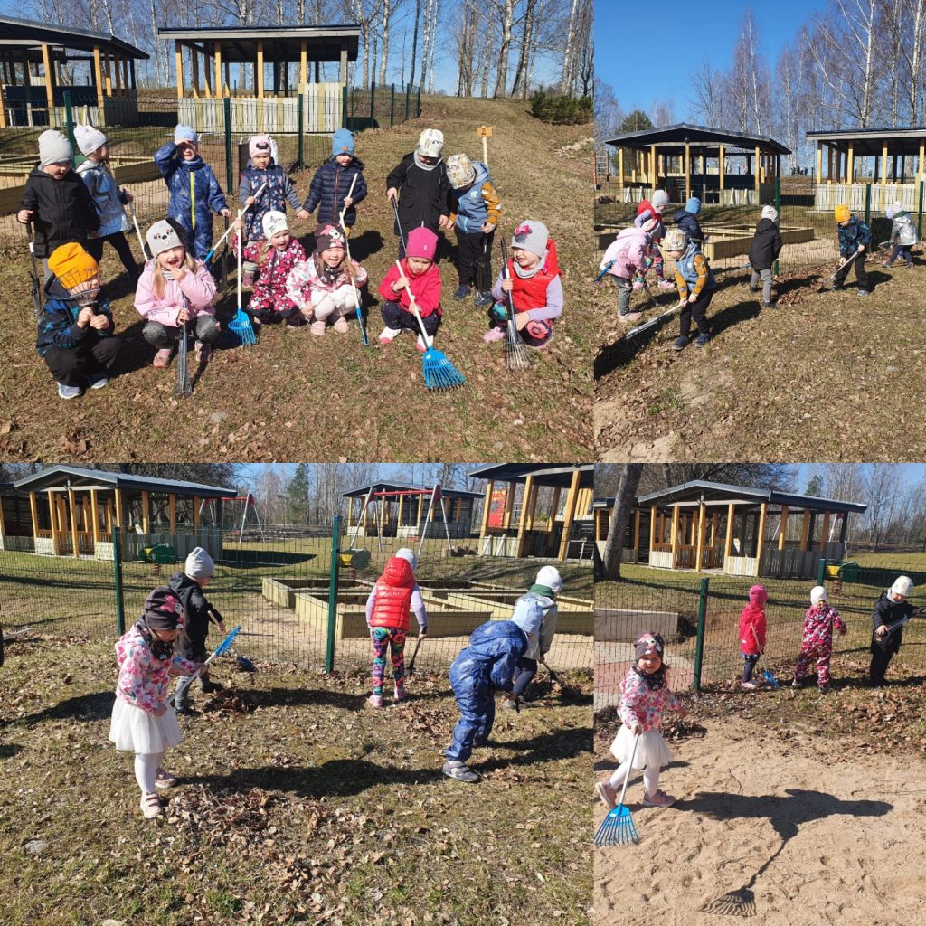 Grupām bija sagatavoti uzdevumi atbilstoši vecumam – sadalītas teritorijas, ko katra grupa apņēmības pilni devās sakopt! Grāba lapas un lika maisos, ko vēlāk izbēra komposta kaudzēs, gan vāca žagarus, ko negantais vējš nolauzis kokiem!
