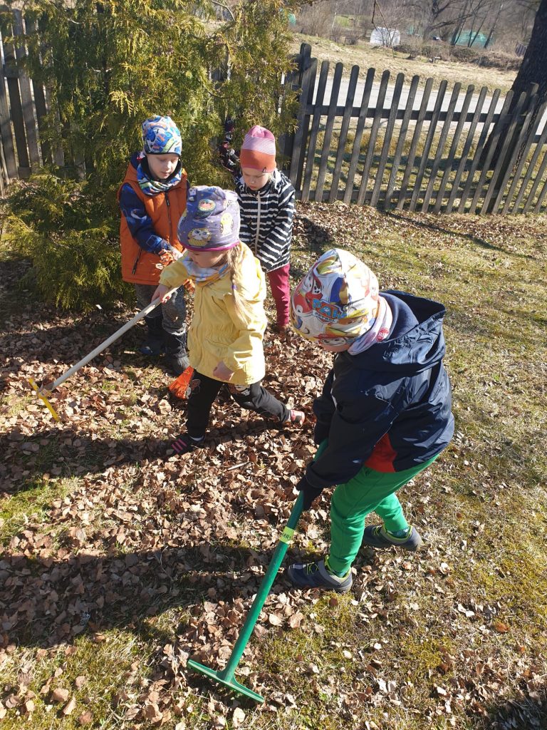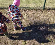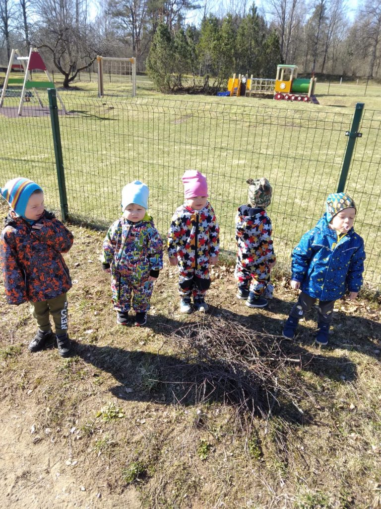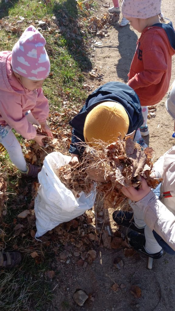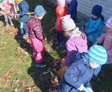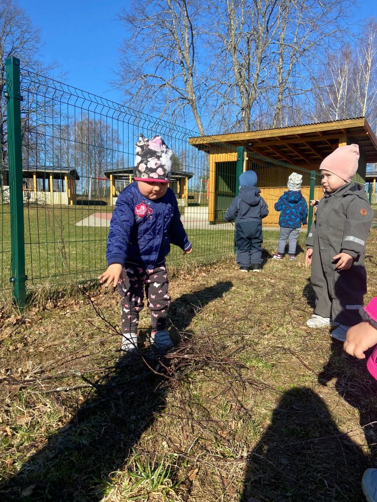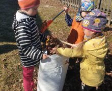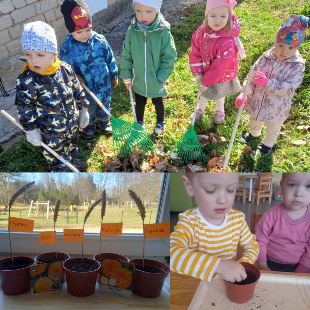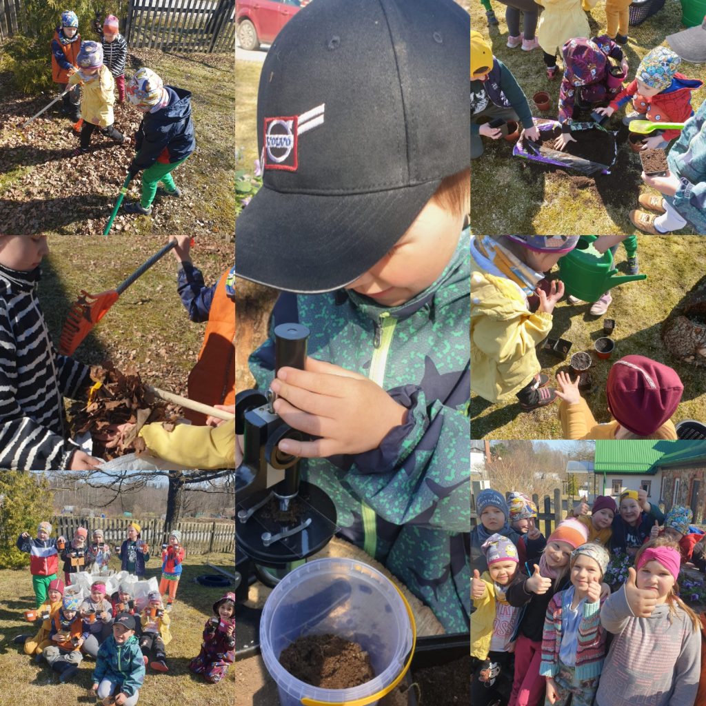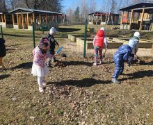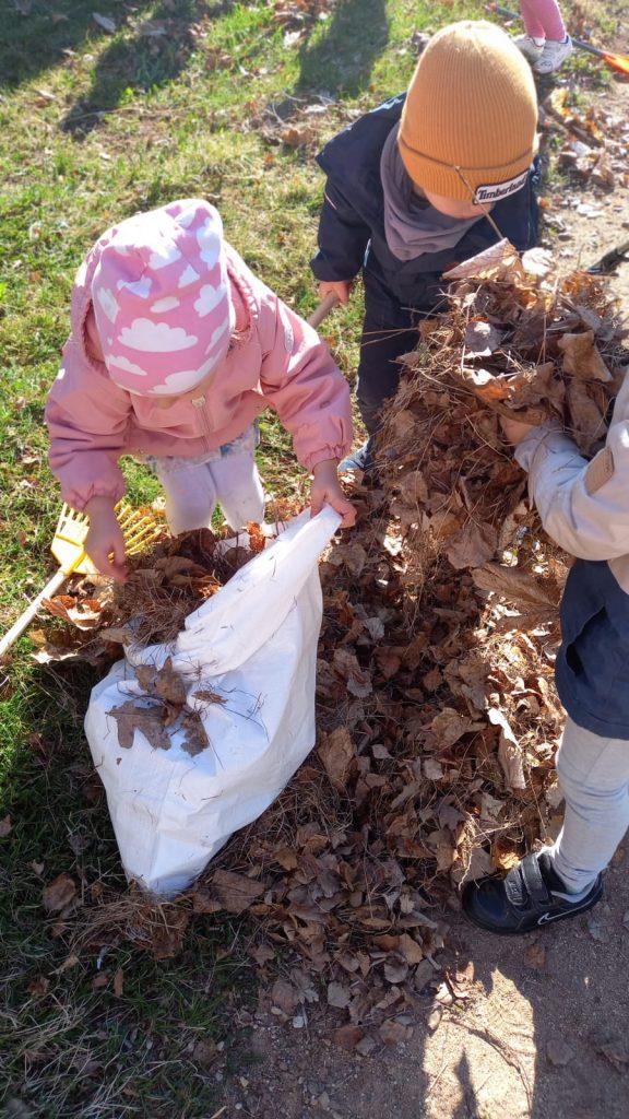 Grupām bija sagatavoti uzdevumi atbilstoši vecumam – sadalītas teritorijas, ko katra grupa apņēmības pilni devās sakopt! Grāba lapas un lika maisos, ko vēlāk izbēra komposta kaudzēs, gan vāca žagarus, ko negantais vējš nolauzis kokiem!