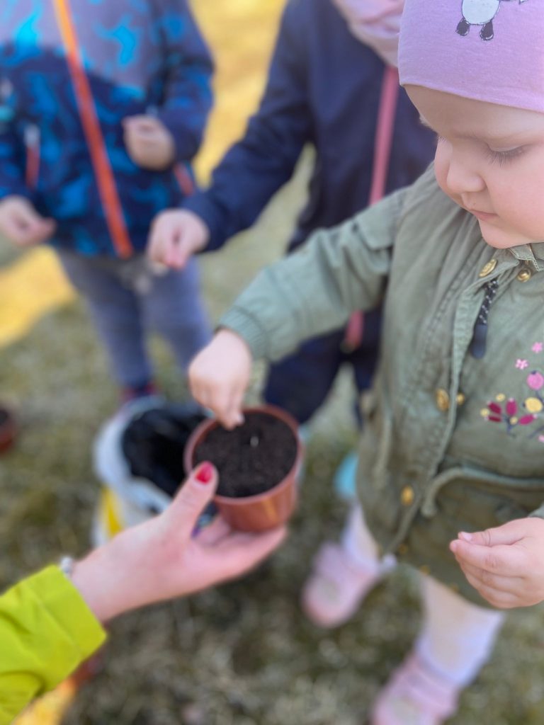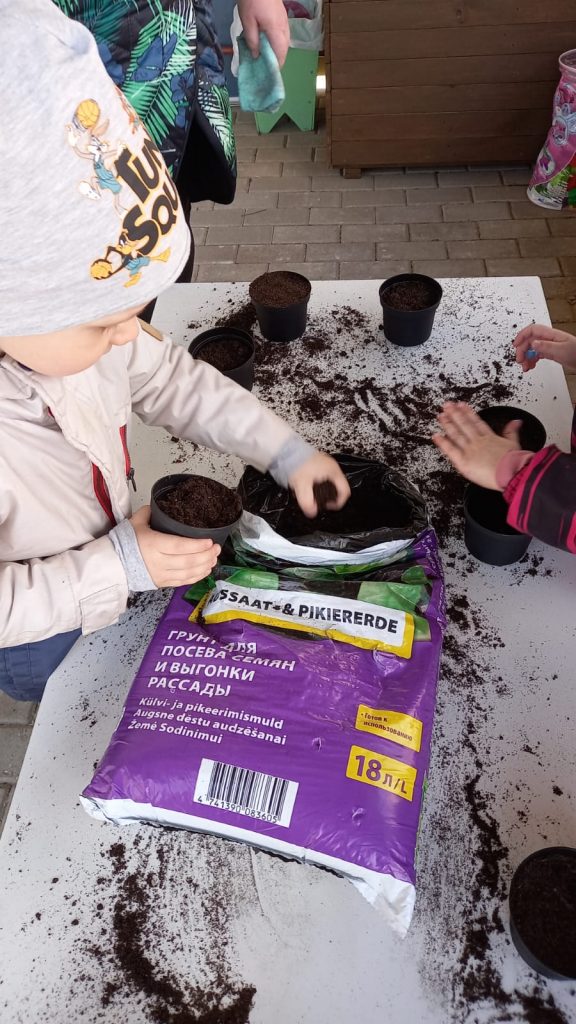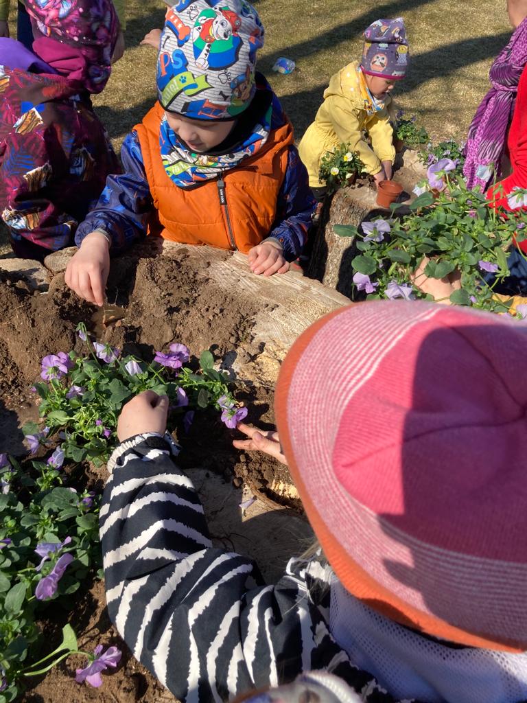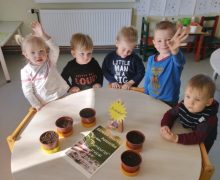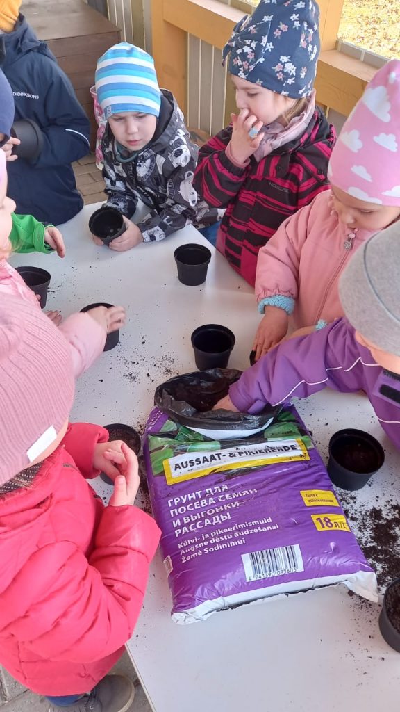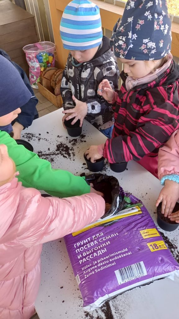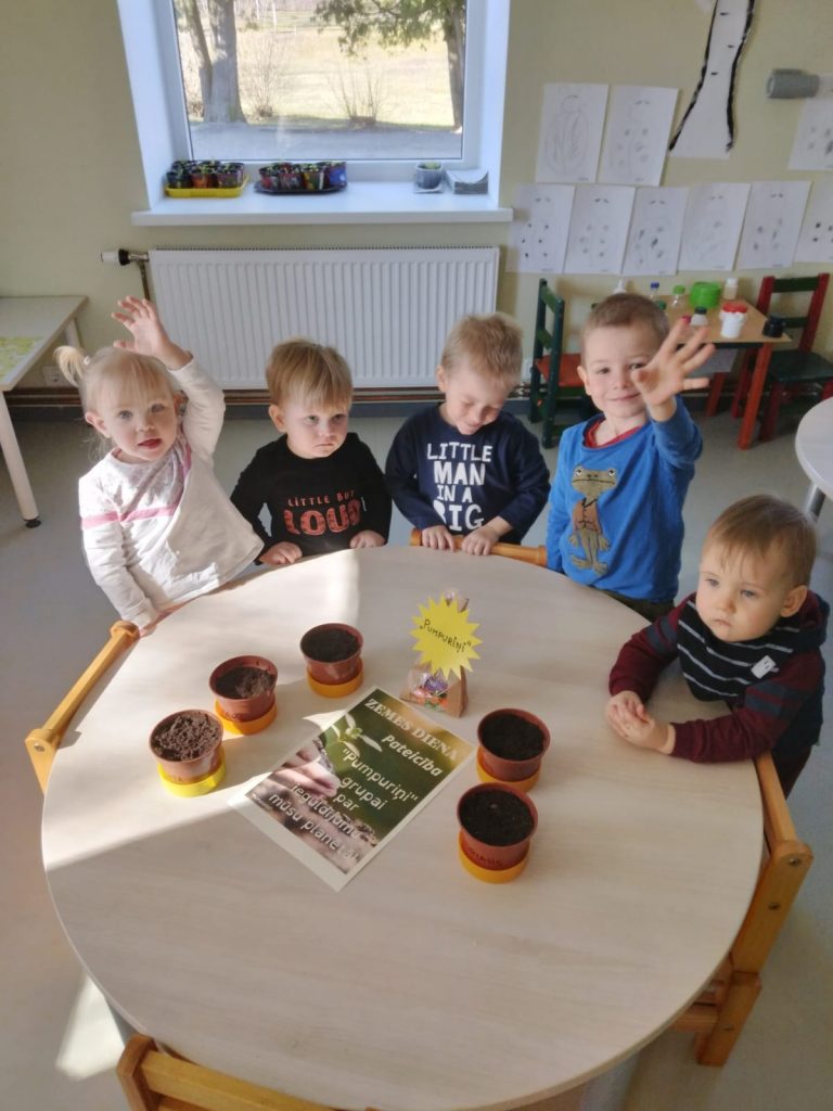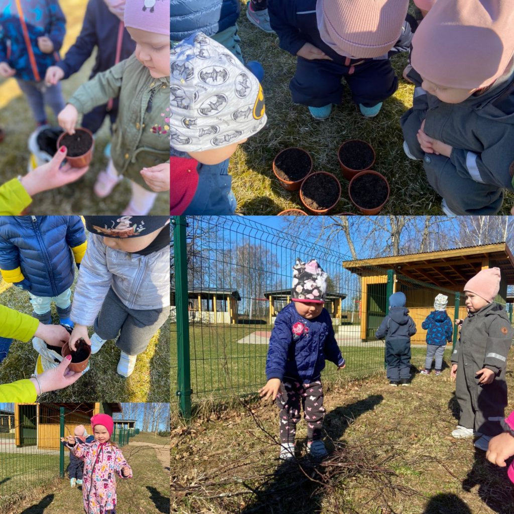 Tāpat arī tika sētas puķes, kuras vēlāk stādīsim iestādes teritorijā – samtenes un saulespuķes. Vai pamanīji, cik skaisti celmi pie iestādes? Par to parūpējās ”Zīļuki” iestādot atraitnītes!