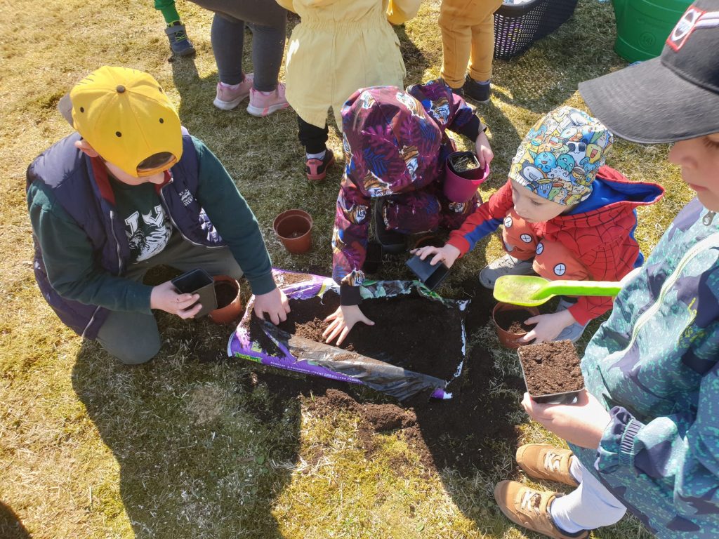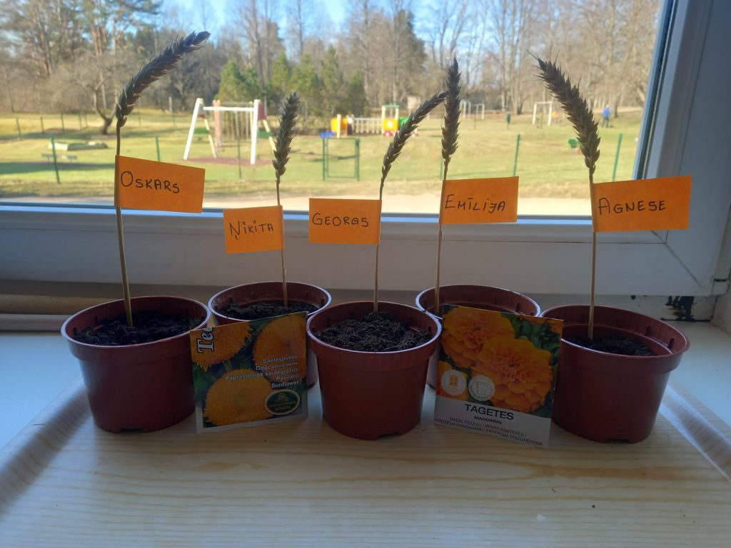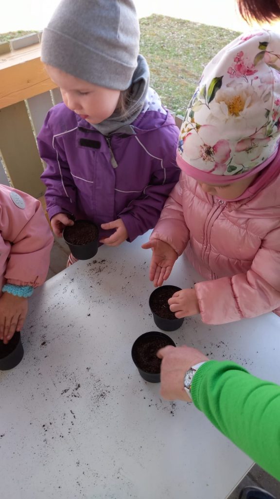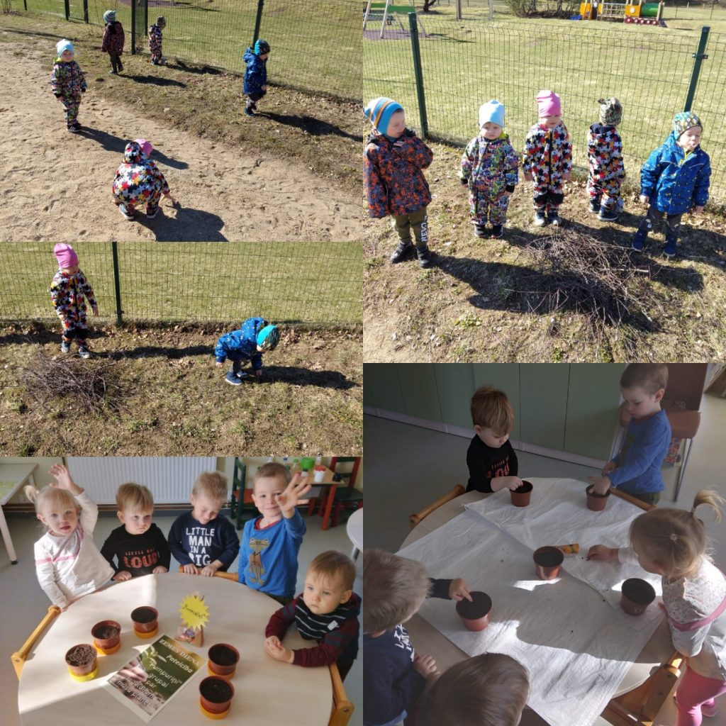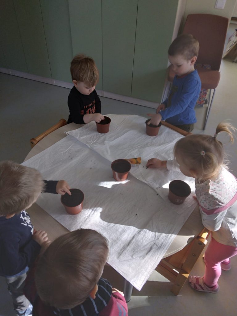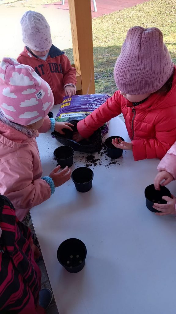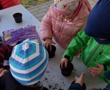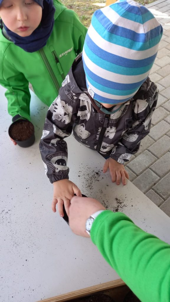 Tāpat arī tika sētas puķes, kuras vēlāk stādīsim iestādes teritorijā – samtenes un saulespuķes. Vai pamanīji, cik skaisti celmi pie iestādes? Par to parūpējās ”Zīļuki” iestādot atraitnītes!