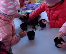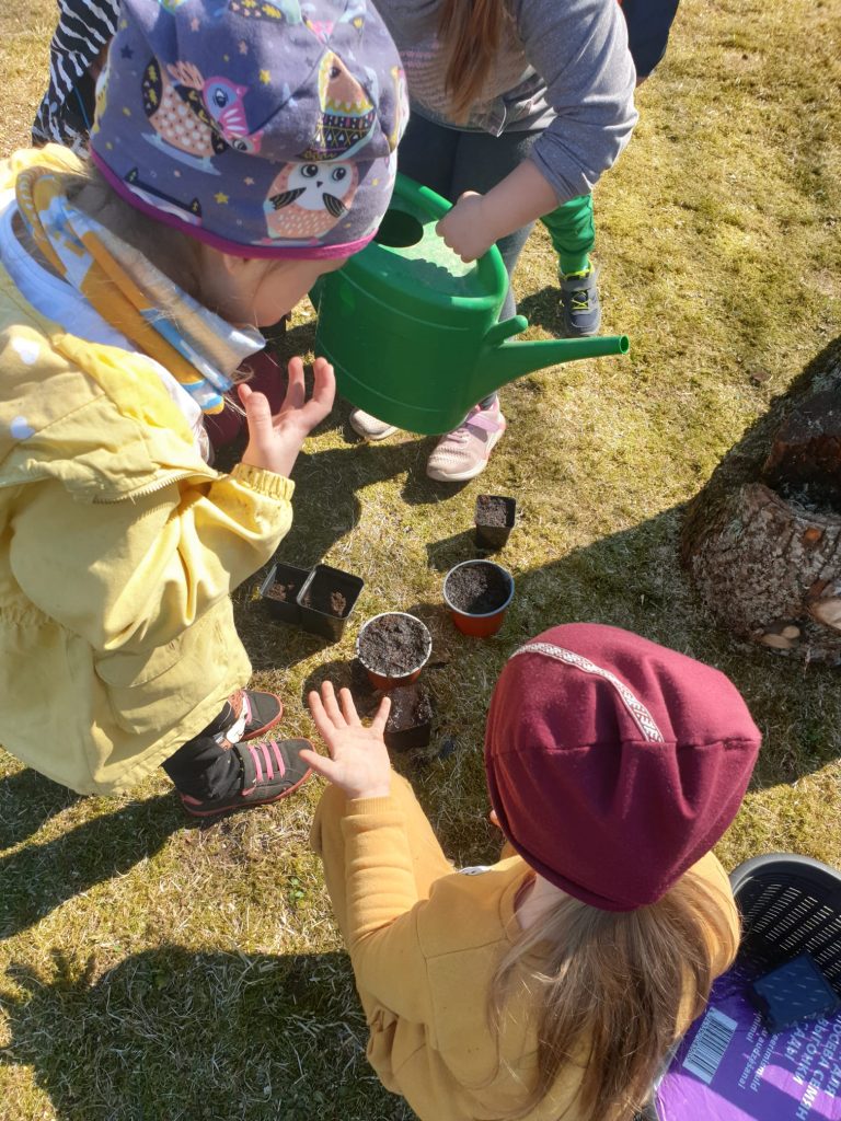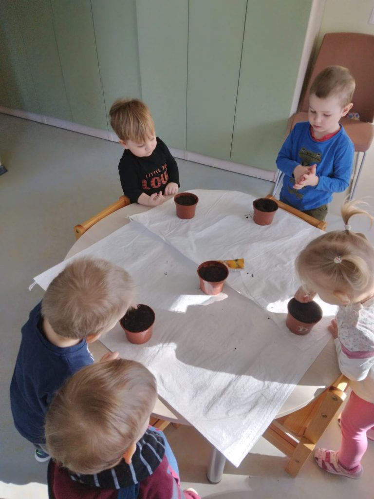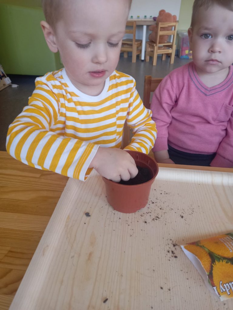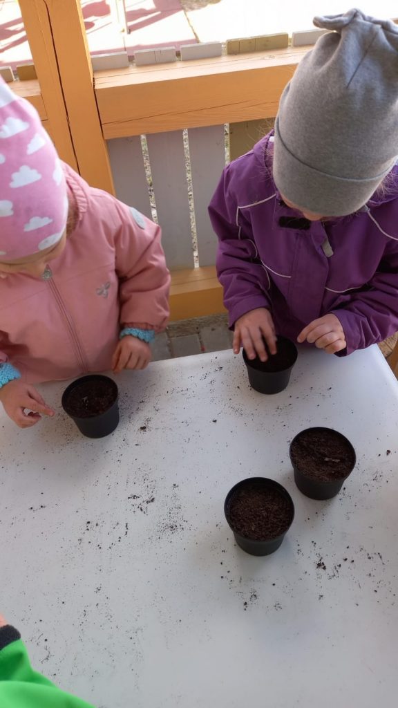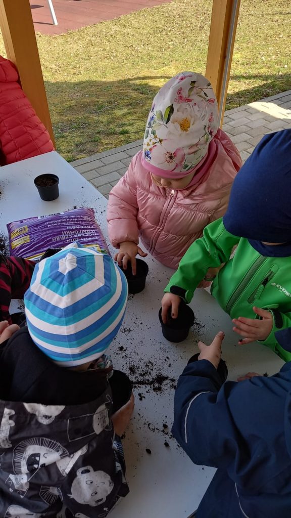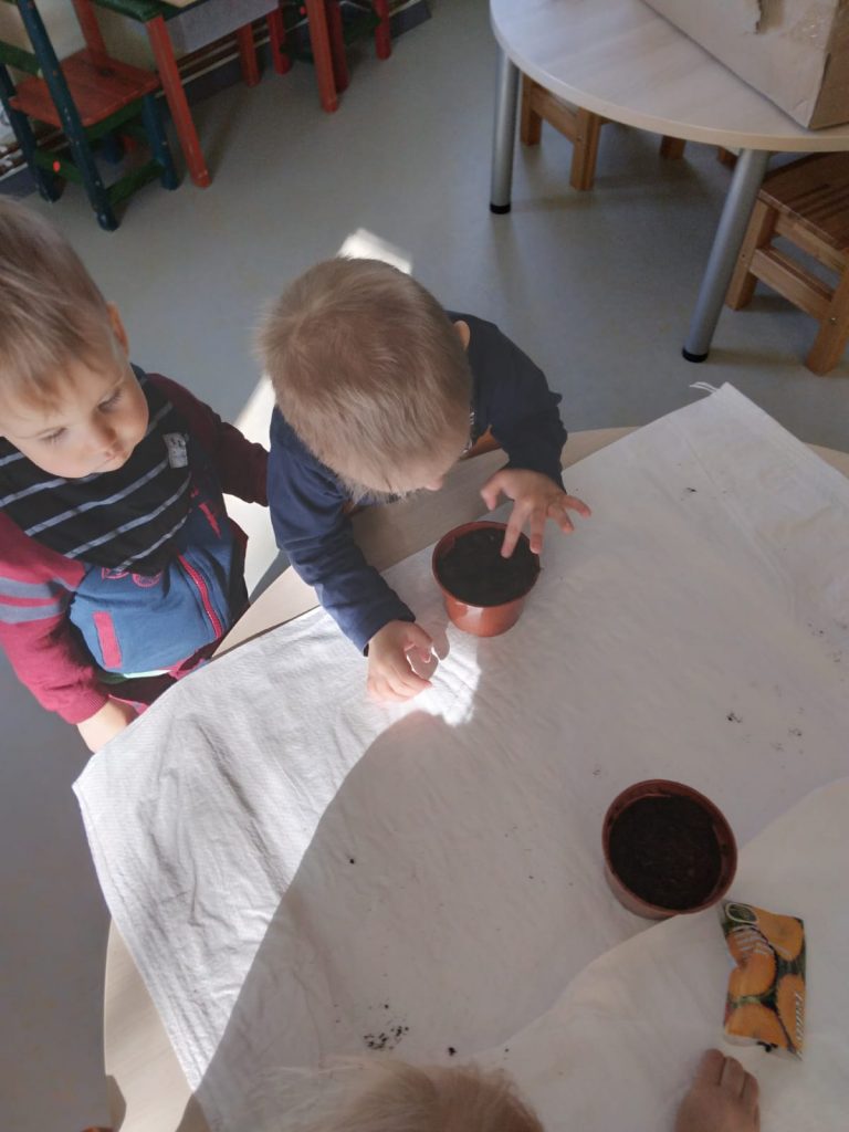Tāpat arī tika sētas puķes, kuras vēlāk stādīsim iestādes teritorijā – samtenes un saulespuķes. Vai pamanīji, cik skaisti celmi pie iestādes? Par to parūpējās ”Zīļuki” iestādot atraitnītes!