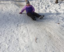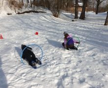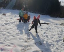 Mazie olimpieši veica dažādas ziemas aktivitātes-brauca ar ragaviņām no kalna, kurš tālāk.